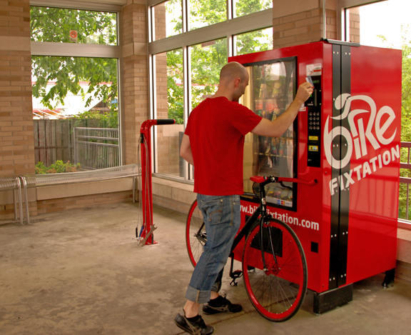 Процесс популяризации велосипедов в западных странах давно кипит. Экологические и транспортные проблемы больших городов в сочетании с развитой велосипедной инфраструктурой давно сделали "руль и колесо" одним из самых совершенных видов транспорта. А ввиду кризиса идей современного уклада жизни и переосмысления рационального потребления, зародилось целое движение DIY(Do it yourself) мастерских (например bikesnotbombs или RAB), занимающихся "переработкой" и вторичным использованием старых велосипедов. Сюда может придти любой желающий со своим двухколесным другом и под присмотром профессионалов починить или восстановить свой велосипед. А некоторые мастерские еще и предлагают парковочные места на ночь, прокат и интернет магазин, как барселонский my beautiful parking . Нечто подобное пытались создать в Москве ребята из магазина "Место", но, к сожалению, пока не удалось. В США, а точнее в Миниаполесе пошли дальше. Там придумали и реализовали городские мини станции тех обслуживания для велосипедов. Bike Fixtation - представляет собой автомат по продаже мелких запчастей: трубки, катафоты, фонарики, крепежи, закуски, очки и т.п., стойка с необходимыми инструментами и компрессор для накачивания колес. Никогда не знаешь какой камень пробьет тебе камеру или где слетит цепь. Идеальное решение совершенствования велосипедной инфраструктуры и городской среды в целом.